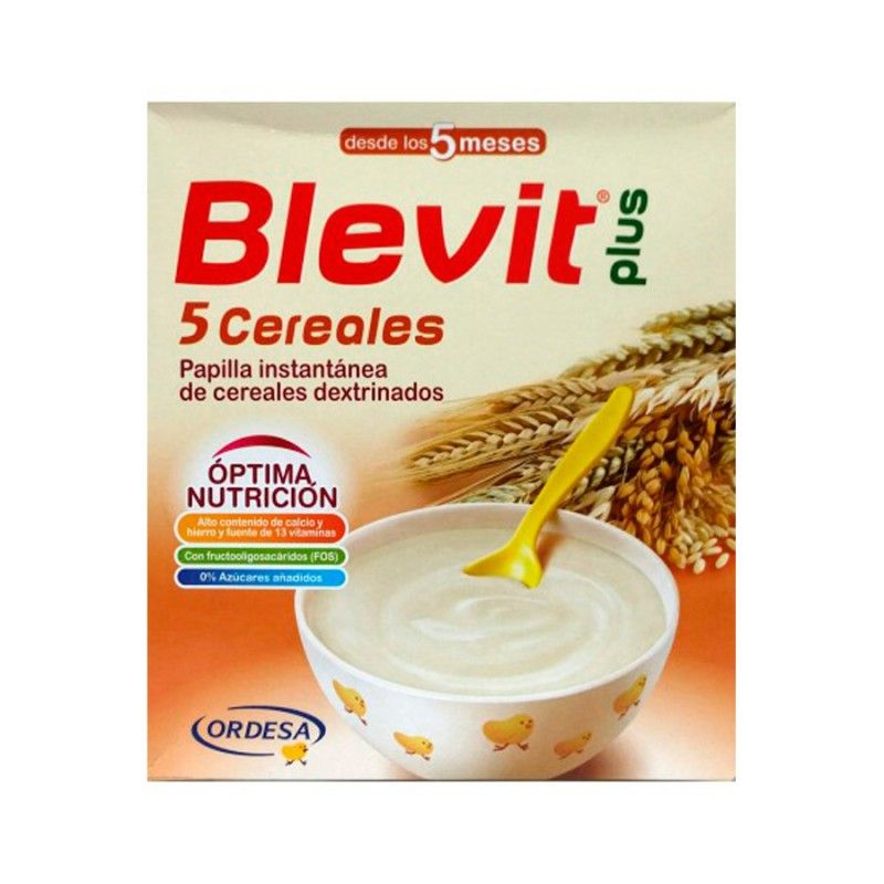 Blevit plus 5 Cereales presenta un alto contenido en calcio y hierro, y es fuente de 12 vitaminas.
