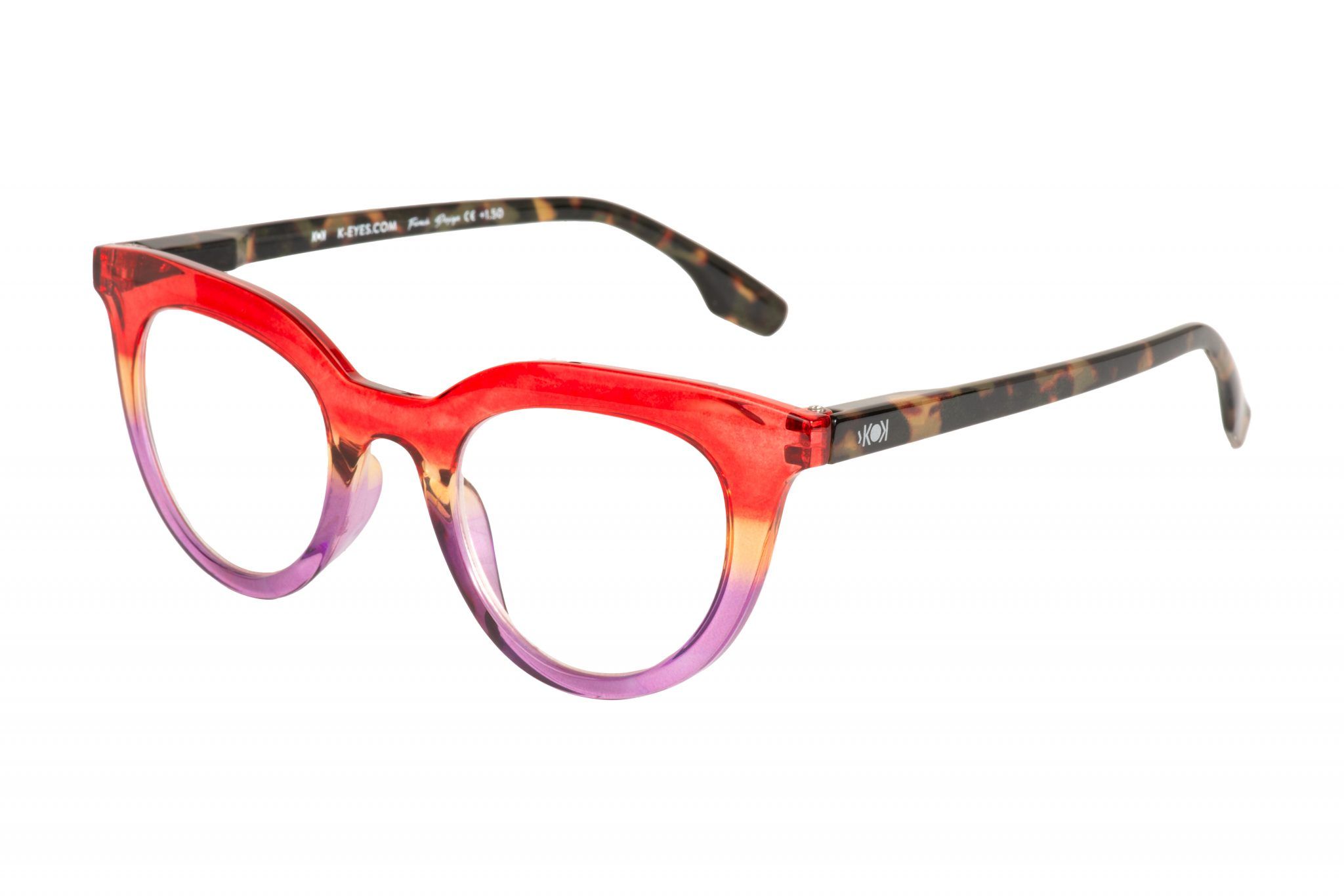 Gafa de lectura con montura en forma de gato, con colores transparentes tornasolados desde el rojo hasta el morado. Forma de cat-eye y varillas en carey.