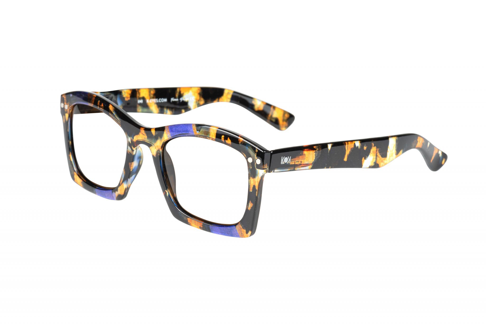 Gafa de lectura con una montura grande. Sus líneas curvas y su forma resaltan el ojo, haciendo que sea una gafa muy favorecedora. la montura y la varilla en color marrón carey con motivos en azul y crema.