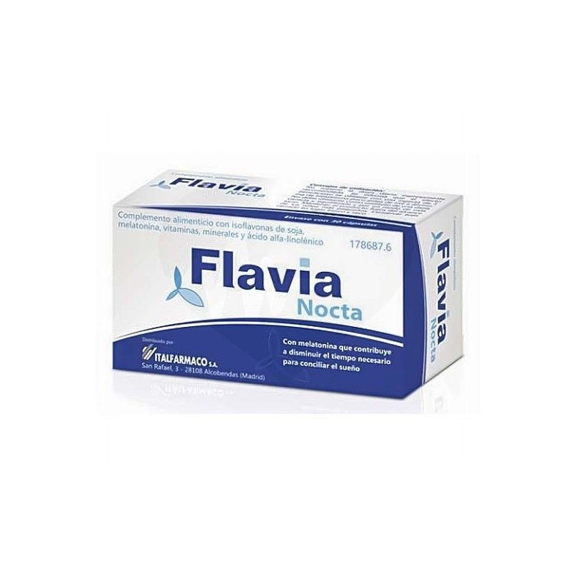 Flavia Nocta es un complemento alimenticio con isoflavonas de soja, melatonina, vitaminas, minerales y ácido linolénico que contribuyen al cuidado integral de la mujer en la menopausia. Además, gracias a su nueva formulación con Melatonina y Magnesio favorece la conciliación del sueño y reduce la fatiga.