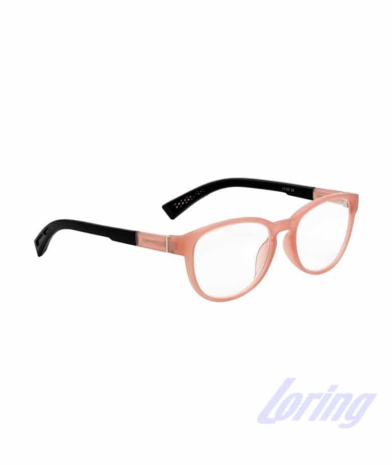 Gafas de lectura para mujer, de policarbonato, es una gafa flexible y cómoda, con una montura de forma redondeada de color rosa mate, y varillas de goma en negro. Son gafas para presbicias ultrarresistentes y muy cómodas.